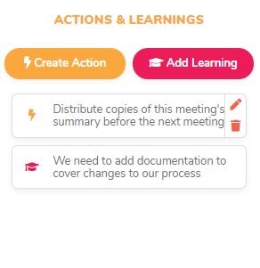 All participants can add actions or learnings during the session, using the ‘Create Action’ or 'Create Learning' buttons in a dedicated column.