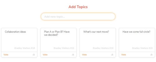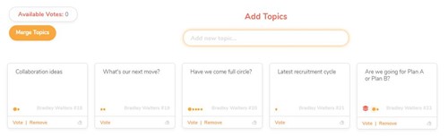 Once the topics have been entered, attendees can vote on which topics they would like to discuss. Initially, everyone have 3 votes. Votes can be removed and recast.