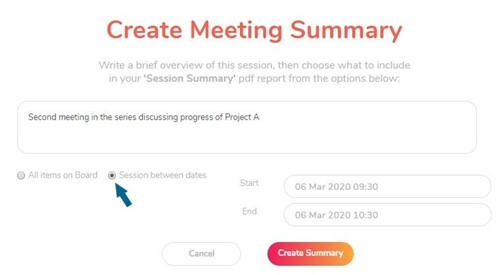 The summary may be created after clicking 'End Meeting' or later using the ‘Create summary’ option in the Facilitator control menu. The summary is created as a .pdf which is automatically downloaded onto your desktop.