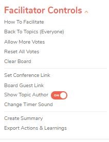 Once the board has been created, the facilitator can use the Facilitator Control menu to run the meeting. This menu is visible only to facilitators. Facilitators may add in a conference link if this was not set up earlier in the 'Customise your Meeting' screen and the 'board guest link' can be easily shared.