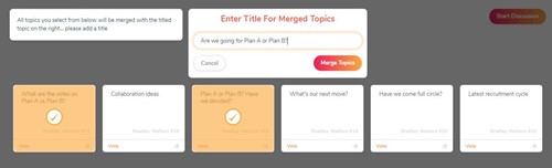 Facilitators have the option to select similar topic cards and combine them into a new card. Any votes already cast on the original 'child' cards will be added to the new 'parent' topic card.