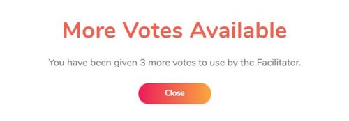 The facilitator has the option to allow each participant a further set of votes after the 3 initial votes are cast by using the 'Allow more votes' option in the Facilitaor control menu. This option may be used repeatedly.