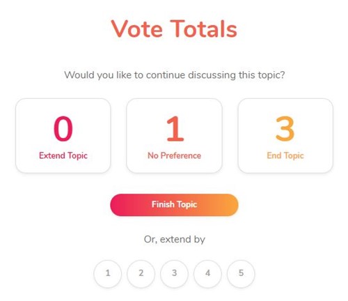 The end/extend/no preference votes are displayed in real time. The facilitator may call an end to the voting and either add more time to the current discussion or move on to the next topic based on the votes cast. A time extension of up to 5 minutes can be selected.